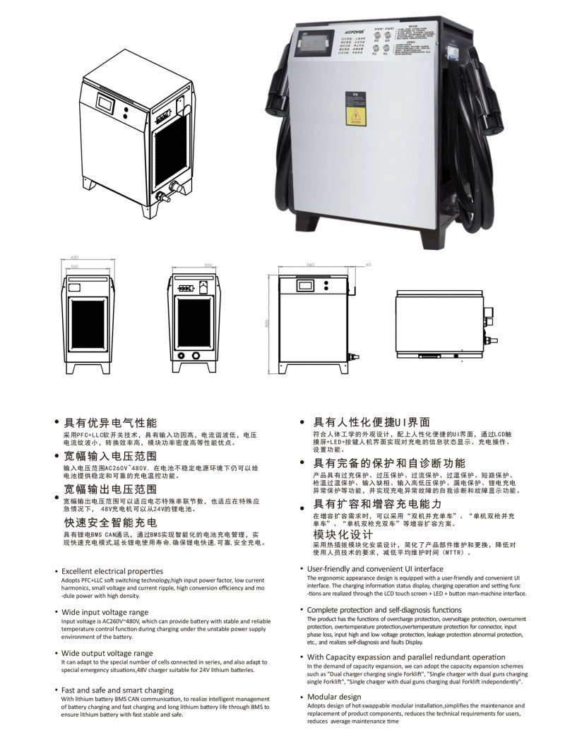 觸摸屏智能操作設(shè)計(jì):告別傳統(tǒng)按鍵方式,給您帶來更現(xiàn)代更具科技智能的操作體驗(yàn) 自動充電:插槍自動充電,簡化充電流程,便于操作 兼容性高:80V200A兼容48V200A充電 多重保護(hù): 輸出短路,過流過壓保護(hù),反接保護(hù),電流導(dǎo)管保護(hù)等多重保護(hù) 預(yù)約充電功能:避開高峰用電時(shí)段,有效節(jié)省成本 雙語切換:中英文雙語隨需切換,跨越語言障礙,與世界接軌 人性化設(shè)計(jì):充電機(jī)背板內(nèi)部附部件明細(xì)及產(chǎn)品接線圖,方便客戶可更清楚的了解產(chǎn)品,便于維修,提高售后時(shí)效 獨(dú)特設(shè)計(jì): 內(nèi)置電磁鎖驅(qū)動模塊,防止臨時(shí)斷電鎖槍 使用壽命更長:功率模塊預(yù)留20%空間,提高模塊的使用壽命 出色內(nèi)部結(jié)構(gòu): 內(nèi)部結(jié)構(gòu)左右出風(fēng),內(nèi)部電路不容易積粉塵,提高充電機(jī)壽命