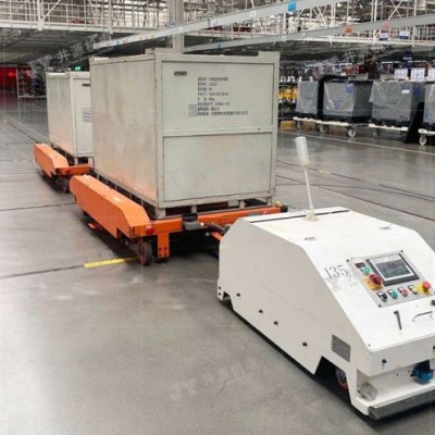 尾部牽引型AGV滿足多種物料配送,具備自動(dòng)后退對(duì)接功能。
