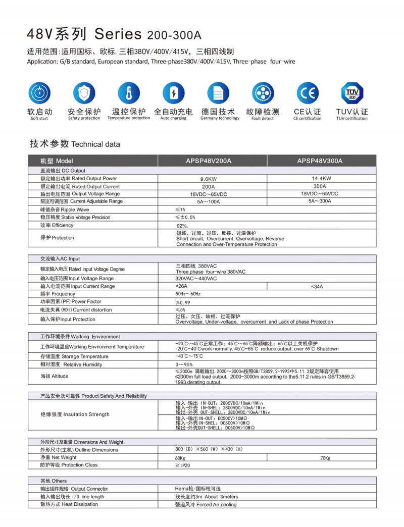 觸摸屏智能操作設(shè)計:告別傳統(tǒng)按鍵方式,給您帶來更現(xiàn)代更具科技智能的操作體驗 自動充電:插槍自動充電,簡化充電流程,便于操作 兼容性高:80V200A兼容48V200A充電 多重保護: 輸出短路,過流過壓保護,反接保護,電流導(dǎo)管保護等多重保護 預(yù)約充電功能:避開高峰用電時段,有效節(jié)省成本 雙語切換:中英文雙語隨需切換,跨越語言障礙,與世界接軌 人性化設(shè)計:充電機背板內(nèi)部附部件明細及產(chǎn)品接線圖,方便客戶可更清楚的了解產(chǎn)品,便于維修,提高售后時效 獨特設(shè)計: 內(nèi)置電磁鎖驅(qū)動模塊,防止臨時斷電鎖槍 使用壽命更長:功率模塊預(yù)留20%空間,提高模塊的使用壽命 出色內(nèi)部結(jié)構(gòu): 內(nèi)部結(jié)構(gòu)左右出風(fēng),內(nèi)部電路不容易積粉塵,提高充電機壽命