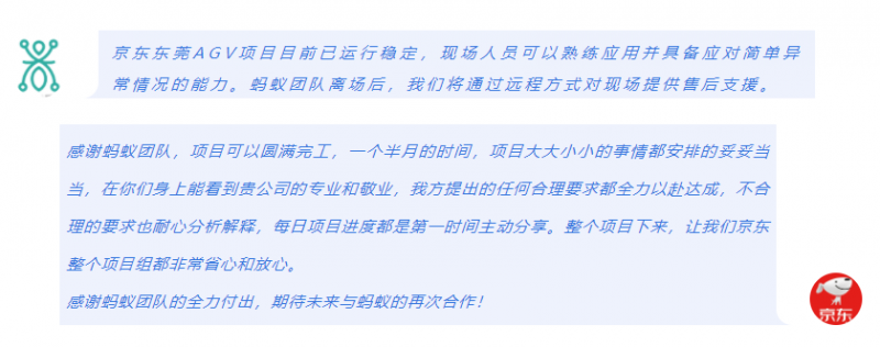 從售前方案制作到項目交付,螞蟻機器人一直兢兢業業,用專業和敬業為項目畫上一個完美的句號,并得到了客戶的一致點贊。螞蟻機器人為京東量身打造的柔性物流解決方案,顯著提升了改造倉的物流服務質量,助力京東物流創造更大的價值。