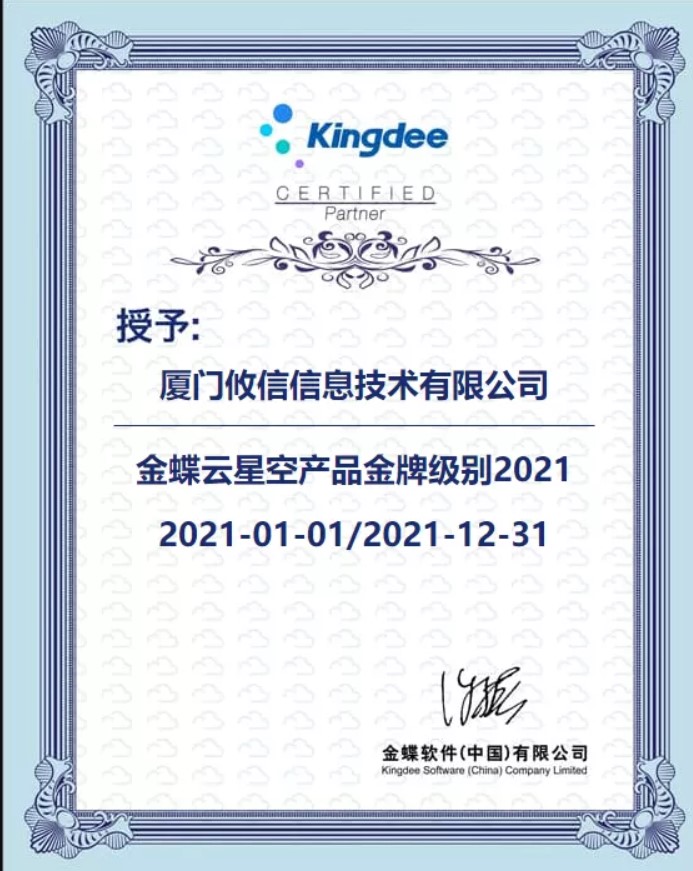 發證機構:   金蝶(軟件)中國有限公司 發證時間 :   2021-01-01