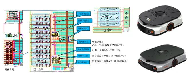 該鈑金生產工廠,制造車間共分兩大庫區,共計15條產線,600+庫位現場需融合機械臂生產入庫,采用水墨屏數字化管理,并部署AMR自主移動機器人搬運料車自動入庫、配送至產線,同時使用RFID技術實現智能物料盤點,最終實現兩大庫區內的智能化高效生產。