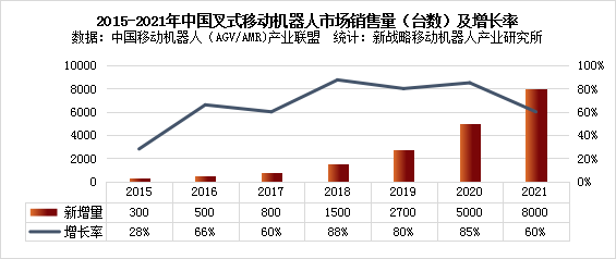 圖表:2015-2021年中國叉式移動機器人市場銷售量(臺數)及增長率