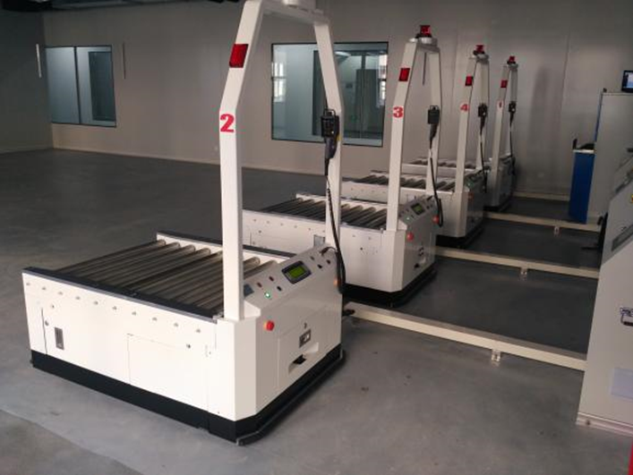 化成分容段采用輔助定位,保證側向背輥AGV與輥筒輸送機的精準對接。化成分容段和組裝烘烤采用光通訊交互,實現AGV背輥和輥筒輸送機的同步傳動。AGV通道狹窄,對AGV的導航穩定可靠性、定位精度有極高的要求?;煞秩輲霢GV運行通道狹窄(寬2.8米),因此要求AGV設計比較小巧,滿足通道內雙向運行需求?;煞秩輲霢GV側面滾筒裝卸貨的設計,更符合現場多物流線多站臺的作業模式,能夠在站臺裝完即走。化成分容庫AGV四面防護的透明亞克力板罩設計,能有效隔離灰塵,同時滿足人工抽樣檢測電池的需求。