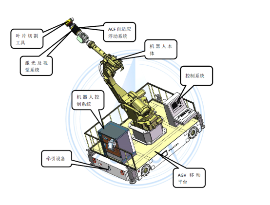 在葉片切割打磨系統(tǒng)的應用案例中,航天智造導入了全向移動AGV載六關節(jié)臂式機器人,機器人腕部配ACF自適應浮動系統(tǒng),激光及視覺引導自動打磨切割,航天定制切割打磨頭,實現(xiàn)60米以上葉片2個小時內完成前后緣處理;風電葉片打磨機器人系統(tǒng),屬于大型曲面磨拋技術,主要技術點在于恒力控制和AGV協(xié)同機器人軌跡規(guī)劃技術,一支葉片60米一次打磨率超過80%,完成效率不超過2個小時。