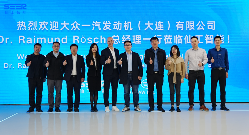 大眾一汽發動機總經理 Dr. Raimund Rösch、總經理助理韓露露、生產技術總監宋百秋、生產機加經理王向國、生產技術經理曹殿廷等一行人蒞臨仙工智能總部參觀交流并參與簽約儀式。
