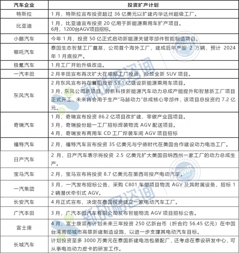 上半年部分車企投資擴(kuò)產(chǎn)及AGV項(xiàng)目招標(biāo)情況分析(根據(jù)公開信息整理,如有錯(cuò)誤,請(qǐng)指正!)