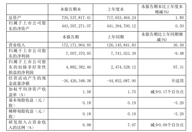 瑞晟智能發(fā)布2023年半年度報(bào)告。半年報(bào)顯示,公司實(shí)現(xiàn)營業(yè)收入1.72億元,同比增長(zhǎng)36.49%;歸屬于上市公司股東的扣除非經(jīng)常性損益的凈利潤(rùn)488.24萬元,同比增長(zhǎng)97.31%。