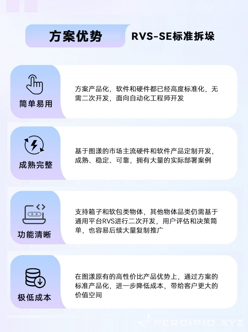 圖漾科技發(fā)布RVS-SE(RVS Standard Edition),面向拆垛類應(yīng)用提供完整的3D視覺方案標準產(chǎn)品,可與主流工業(yè)機器人配合,無需二次開發(fā)即可輕松完成拆垛工作站的實施與交付。