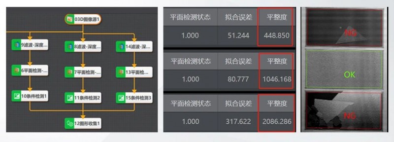 針對疊片和碎片缺陷檢測,VM 3D軟件中,深度圖像分別定位到每個硅片位置,統計每個硅片位置ROI內平面度,根據平面度情況判斷硅片是否存在破碎和疊片。
