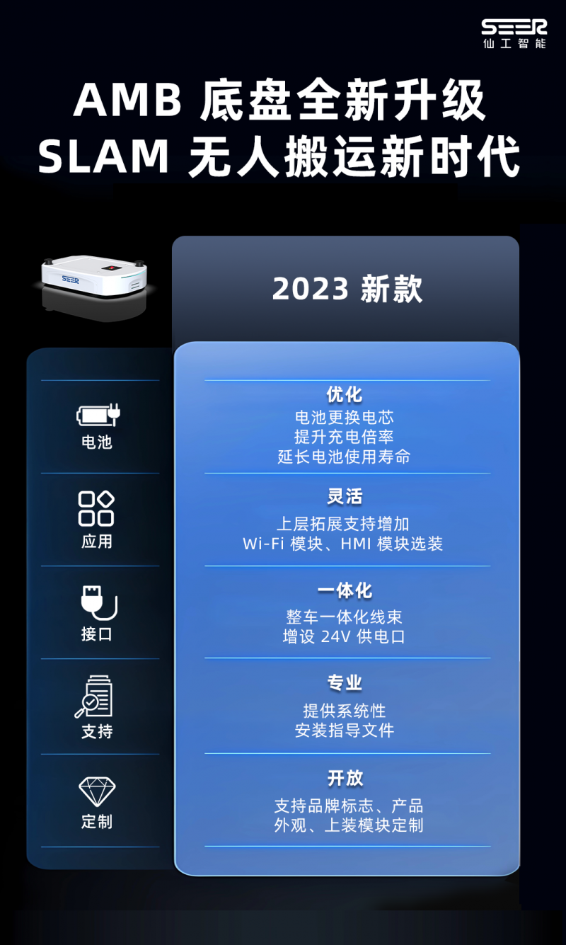 2023 新款 AMB 底盤是對移動機器人通用底盤的再一次全新升級,其功能優化緊密貼合了機器人制造廠商的實際需求。