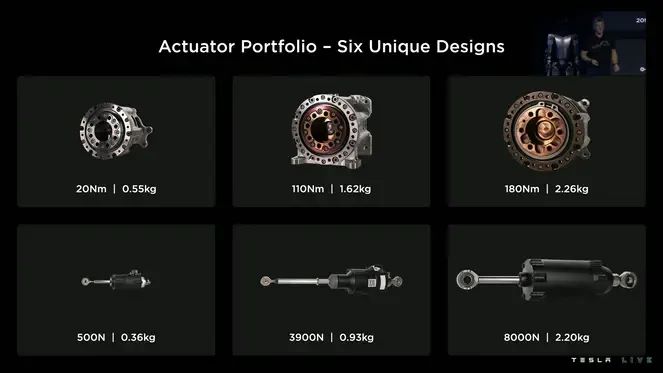 其中,有六種不同的執行器,分別是三種旋轉執行器和三種直線執行器。根據特斯拉給出的數據,在硬件中,旋轉執行器占據最大的價值量。而要解決這一問題,特斯拉最好的辦法就是自己生產執行器,而這又涉及到研發與設計等一系列投入。