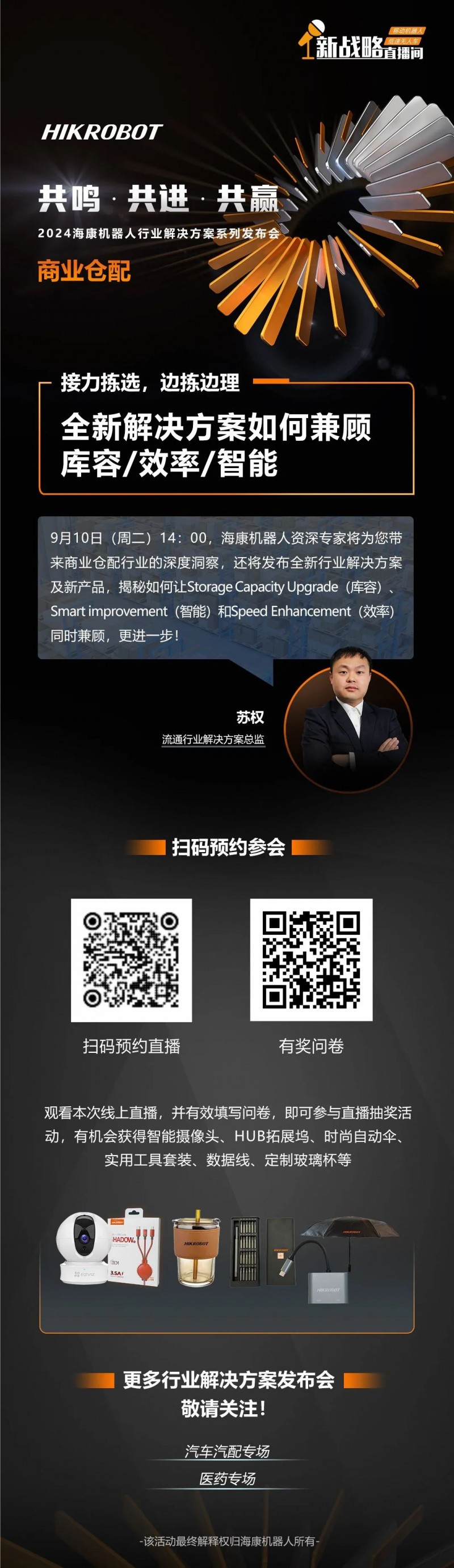 9月10日(周二)14:00,海康機器人資深專家將帶來商業倉配行業的深度洞察與技術分享,同時發布全新行業解決方案和新產品,揭秘新方案如何做到任務解耦,接力揀選,同時突破揀、理貨無法并行的挑戰,做到邊揀邊理,讓