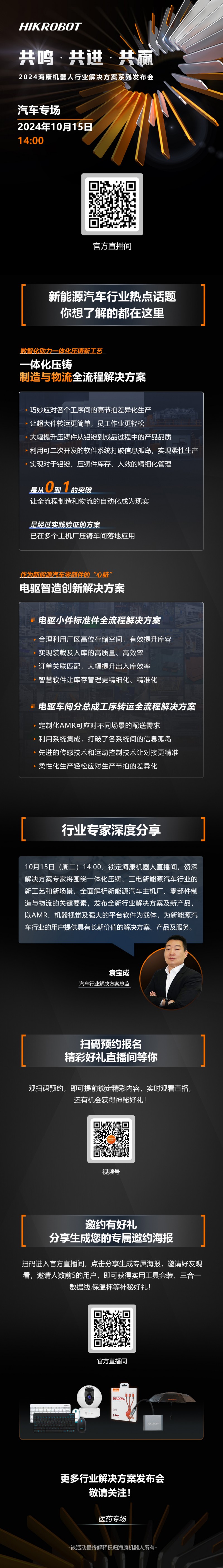 10月15日14:00 鎖定海康機器人直播間,資深汽車行業解決方案專家,將為您深度解析新能源汽車行業熱點話題、創新方案介紹、新品分享、實時答疑,干貨滿滿,更有精美好禮,等您來拿!