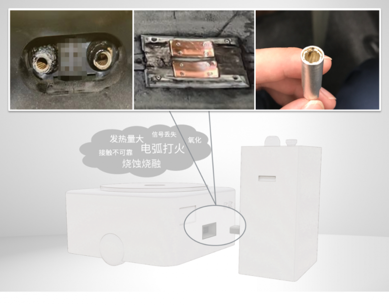 移動機器人(AGV/AMR)與穿梭車等自動化物流設備需要頻繁充電來實現高效運轉,因此充電環節成為潛在風險點。全球知名工商業保險公司 FM Global 在財產防損數據冊《8-34 Protection for Automatic Storage and Retrieval Systems》中強調,AS/RS 系統的安全防護要著重防范充電接觸點出現電弧發熱等風險。移動機器人頻繁充電時,若充電連接器無法適應高插拔工況,隨著插拔次數增加,連接器表面磨損加劇,鍍層和基材受損,接觸電阻上升。磨損到一定程度發生接觸失效,接觸電阻會急劇增大,引發高溫發熱,帶來電氣安全風險。在終端現場,充電故障常表現為無法充電、電弧打火、連接器燒毀等,這不僅降低物流效率,還帶來重大安全隱患。在鋰電、光伏、半導體等火災防控要求極高的行業,這類故障必須嚴格防范,否則極易引發嚴重后果。