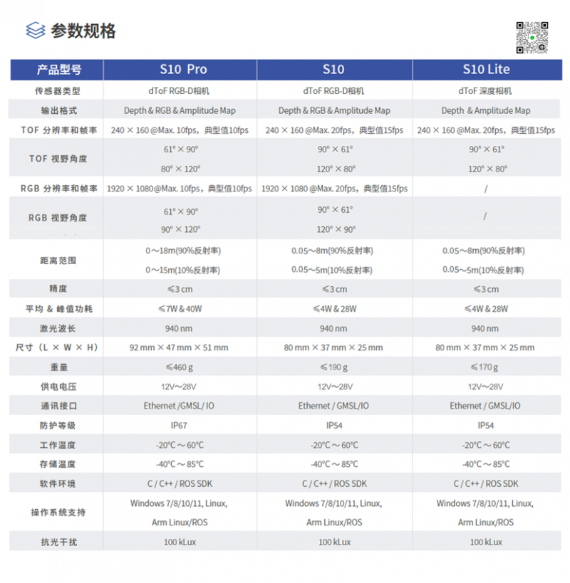 遠距離抗干擾感知:S10基于dToF技術(shù)實現(xiàn)18米遠距離探測,在室外強光(100kLux)環(huán)境下仍可穩(wěn)定輸出深度數(shù)據(jù),提升無人叉車、割草機、室外巡檢機器人等設(shè)備的避障能力。 近距離無盲區(qū):S10基于dToF技術(shù),在30cm以內(nèi)的區(qū)域依然能夠?qū)崿F(xiàn)較高精度(+/-5cm)的感知,保障移動機器人周邊感知無盲區(qū)。 高密度點云輸出:每秒生成超57.6萬個有效點,精準識別低矮物體,為復(fù)雜場景下的導(dǎo)航與避障提供高分辨率數(shù)據(jù)基礎(chǔ)。