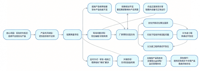 更關(guān)鍵的是,當(dāng)設(shè)備出現(xiàn)定位偏差等問(wèn)題時(shí),設(shè)備廠家的第一反應(yīng)往往是懷疑定位算法,習(xí)慣性依靠研發(fā)與現(xiàn)場(chǎng)工程師的經(jīng)驗(yàn)去“填坑”。這種就事論事的解決思路,導(dǎo)致實(shí)施層面暴露的產(chǎn)品隱患,很難通過(guò)項(xiàng)目復(fù)盤反思,反饋到企業(yè)的整體采購(gòu)管理與品控體系中,最終形成 “治標(biāo)不治本” 的惡性循環(huán)。