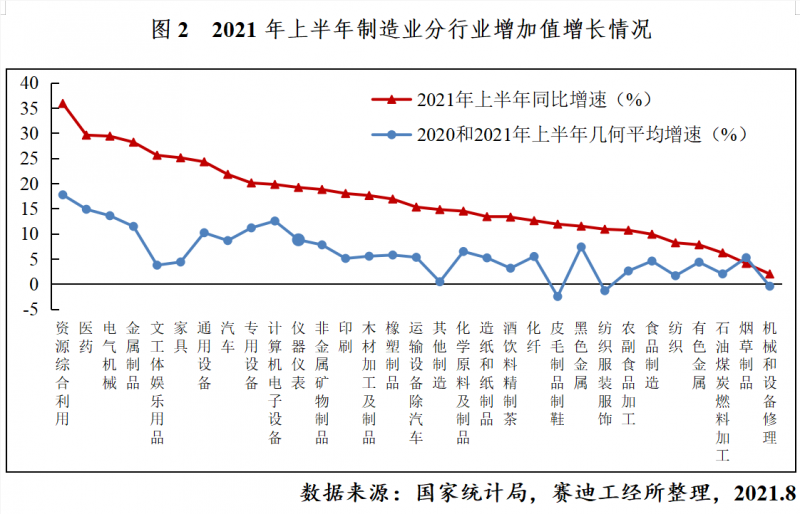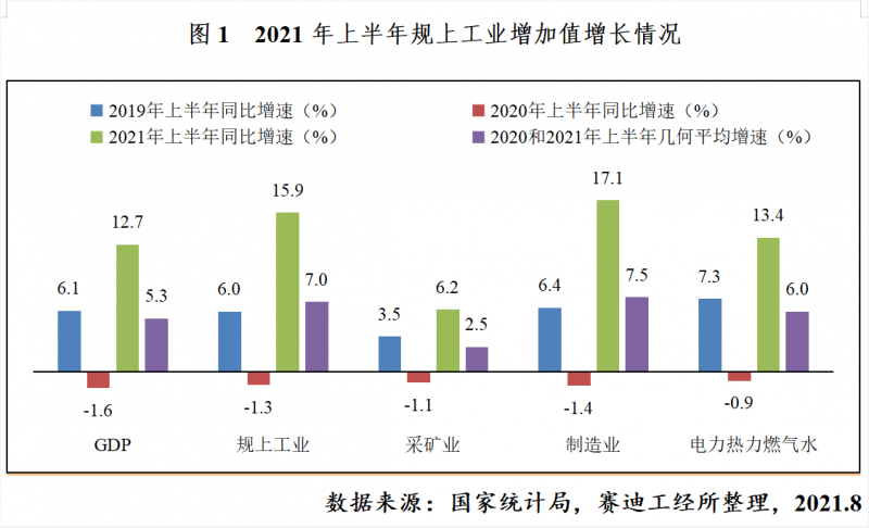 從整體看,2021年上半年工業生產呈恢復性增長態勢。上半年,工業增加值同比增長15.9%,增速較上年同期加快17.2個百分點;兩年平均增長7.0%,平均增速較2019年同期加快1個百分點,達2015年以來同期最高水平。