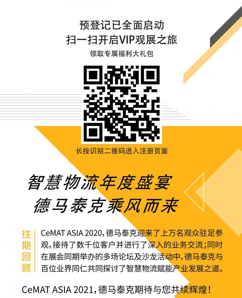 預(yù)約成功后,展會(huì)現(xiàn)場(chǎng)打開(kāi)“德馬泰克”微信公眾號(hào)→“媒體中心”→“CeMAT 預(yù)約”頁(yè)面并登陸,到W1館B4德馬泰克展位前臺(tái)出示給工作人員領(lǐng)取。