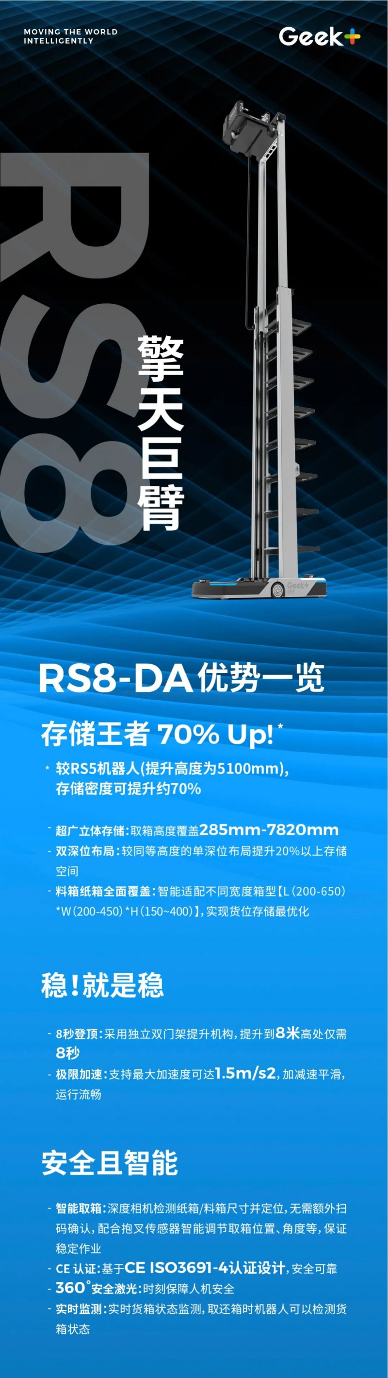 目前,使用傳統(tǒng)人工倉(cāng)的服裝企業(yè)行業(yè)所使用的傳統(tǒng)人工倉(cāng)所來(lái)說(shuō),廠商面臨的不僅對(duì)存儲(chǔ)密度、揀選效率和人員管理有著較高要求,同時(shí)還需要解決人工揀選難度大、顆粒度管理較粗及揀選復(fù)核人效低等痛點(diǎn)。此次最新推出的RS8貨箱機(jī)器人正是助力服裝行業(yè)解決以上痛點(diǎn)的機(jī)器人存揀利器。