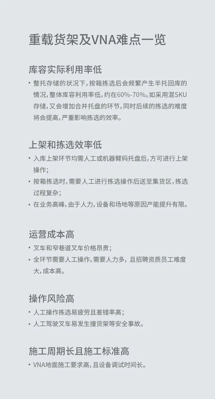 RS8-DA貨箱機(jī)器人主打服裝行業(yè)整箱存取場(chǎng)景,目前,該場(chǎng)景大多采用重載貨架配合人工叉車進(jìn)行揀選,而這種形式多面臨以下難點(diǎn):