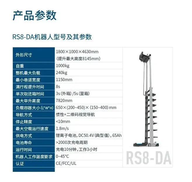 配置雙深可變寬度抱叉的機(jī)型為RS8-DA,其采用雙深位結(jié)構(gòu),配合智能調(diào)寬抱叉,可根據(jù)貨品自動(dòng)調(diào)整抱叉寬度,同時(shí)可以根據(jù)實(shí)際貨箱尺寸分配存儲(chǔ)位置,保證最小貨位間隔。
