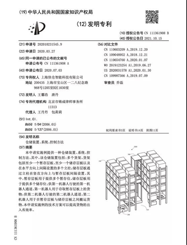 快倉(cāng)Quick Pick方案以其先進(jìn)性和創(chuàng)新性獲得了行業(yè)內(nèi)外的一直認(rèn)可,2021年10月15日快倉(cāng)QuickPick發(fā)明專利獲得正式授權(quán)!
