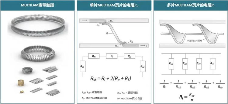 MULTILAM技術(shù),也稱為表帶觸指技術(shù),即在兩個接觸面之間建立平行接觸點,并且提供一定的接觸力,可以破壞污染層,實現(xiàn)有效的電連接。每一個接觸頁片形成獨立的彈性負載回路,通過一圈若干回路的并聯(lián),能大大減少導(dǎo)體之間的接觸電阻。MULTILAM的接觸電阻Rl相當于并聯(lián)連接的接觸頁片的電阻。每一個接觸頁片的幾何形狀均為實現(xiàn)長久的工作壽命而設(shè)計。頁片恒定的彈性壓力可以使接觸界面之間的連接保持穩(wěn)定,從而實現(xiàn)恒定的低接觸電阻。