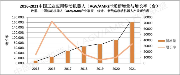 圖表:2016-2021中國市場工業應用移動機器人(AGV/AMR)新增量(臺)與增長率