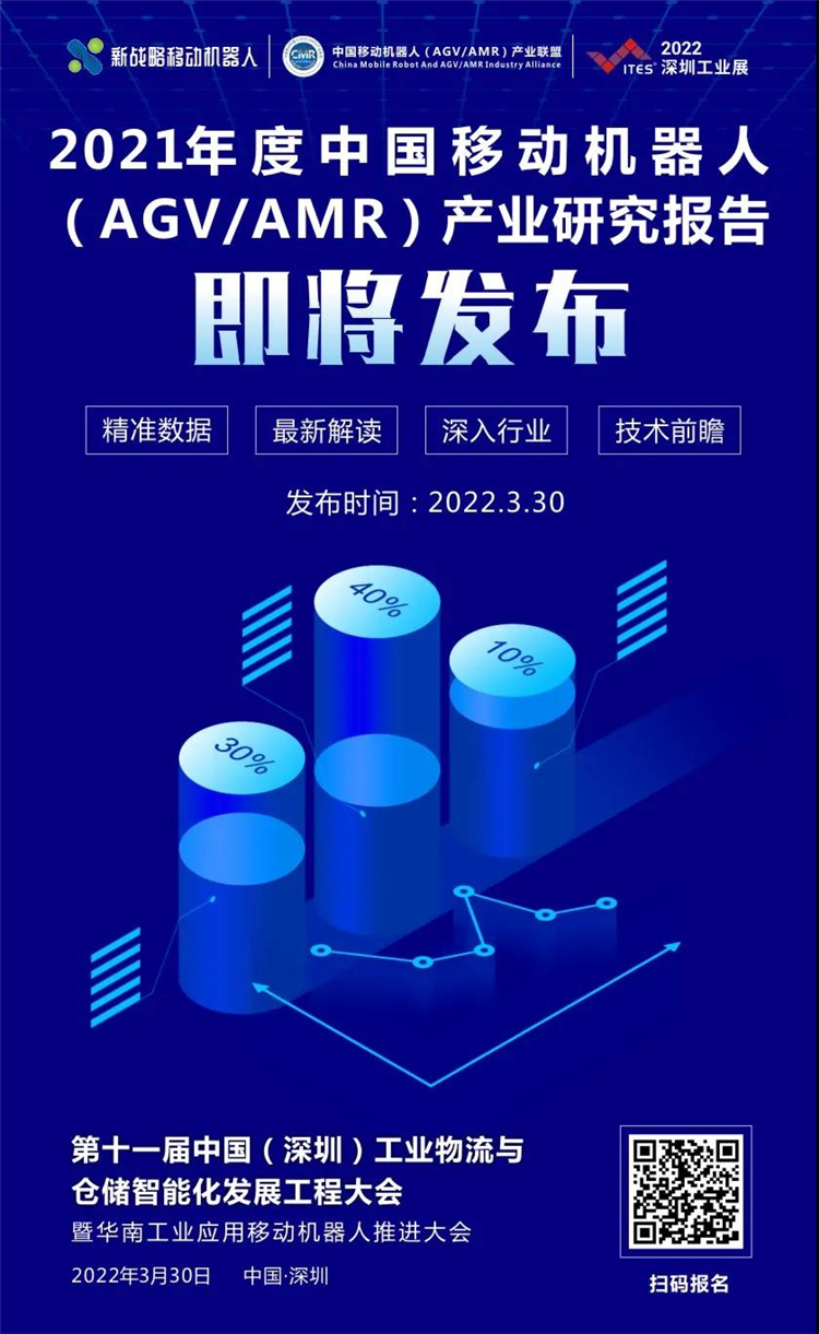 2022年3月30日,在由中國移動機器人(AGV/AMR)產業聯盟舉辦的《中國(深圳)工業物流與倉儲智能化發展工程大會暨華南工業應用移動機器人推進大會》上,《2021年度中國工業應用移動機器人(AGV/AMR)產業發展研究報告》將正式對外發布,敬請期待!