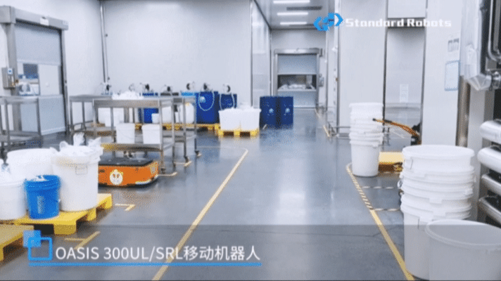 方案中,斯坦德移動機(jī)器人OASIS 300UL/SRL負(fù)責(zé)執(zhí)行乳化車間、包材車間物料運(yùn)輸任務(wù),當(dāng)車間某一設(shè)備需要物料時,由員工使用平板電腦發(fā)送用料需求,通過FMS調(diào)度系統(tǒng)呼叫OASIS 300UL/SRL前來運(yùn)輸物料。