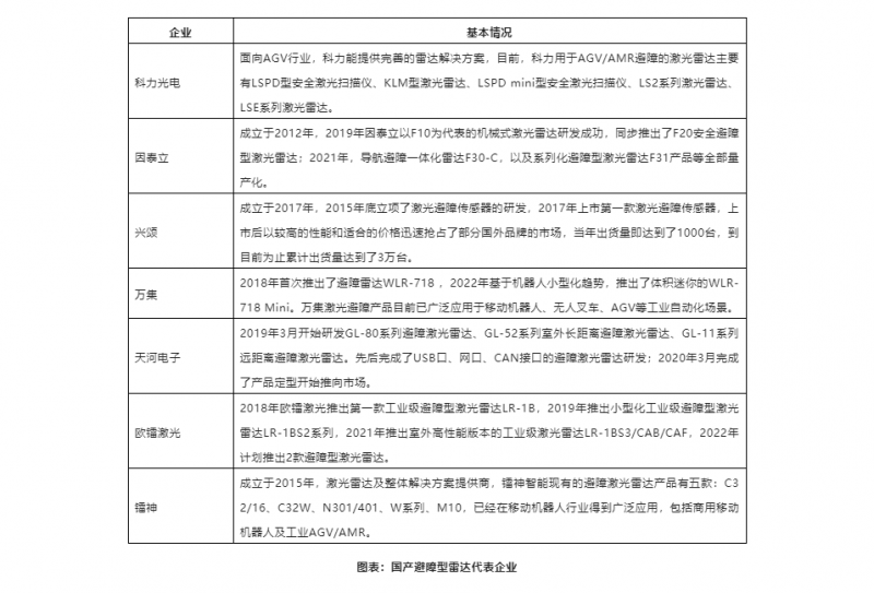 早期國內AGV/AMR行業,無論是避障型還是導航型雷達都以外資品牌應用為主,但從2015年左右開始,伴隨著整個國內AGV產業的發展,國產激光雷達也迎來了發展機遇期,出現了一批代表企業,尤其是在避障型雷達方面,在這些激光雷達廠商的努力下,已經基本實現了國產化,取得了重大的突破。